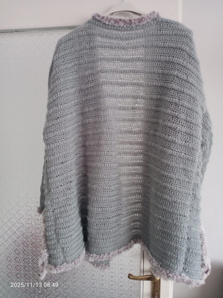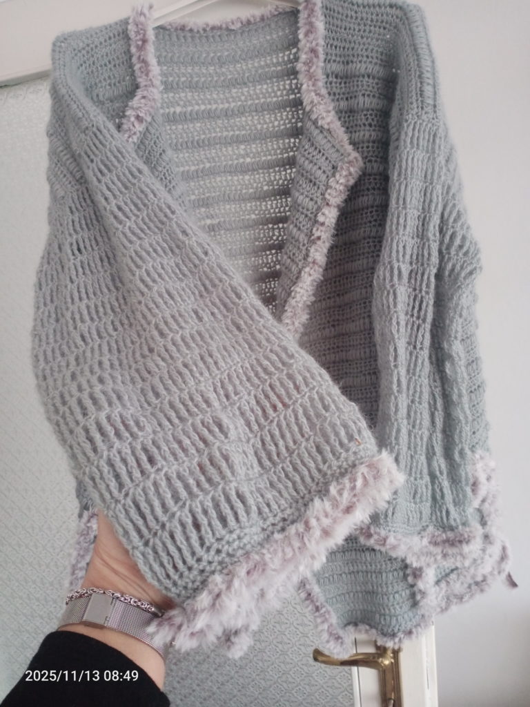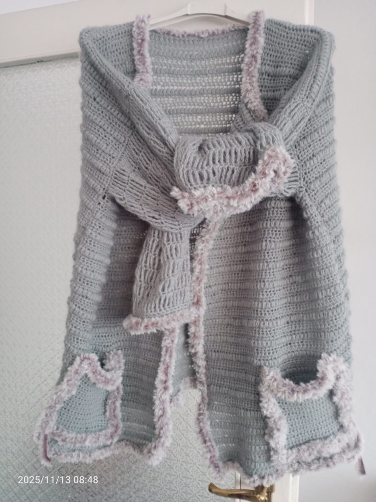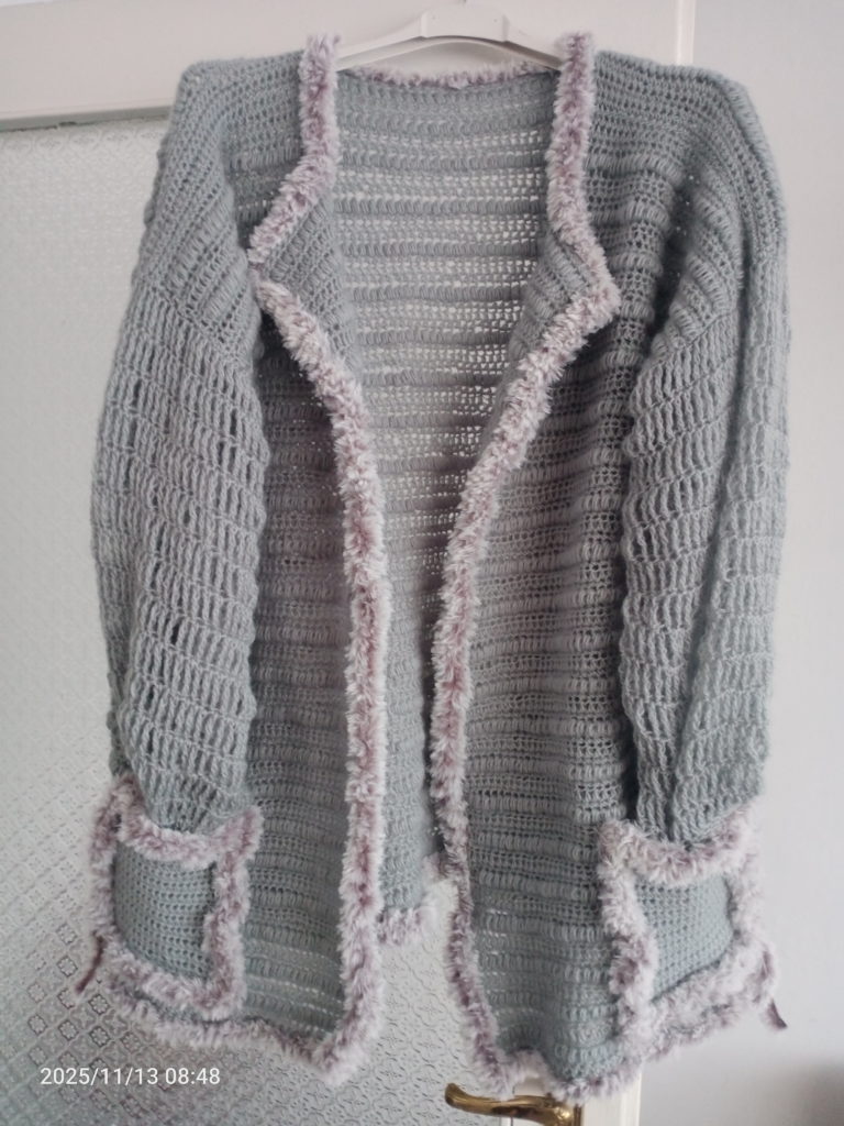 Kardigan szary krótki November 13, 2025 / Krótki kardigan wykonany z włóczki 80% akrylu i 20% wełny. Mimo dodatku wełny kardigan jak to mówią “nie gryzie”. Kardigan pudełko na biust spokojnie do 140cm, długość 72cm.