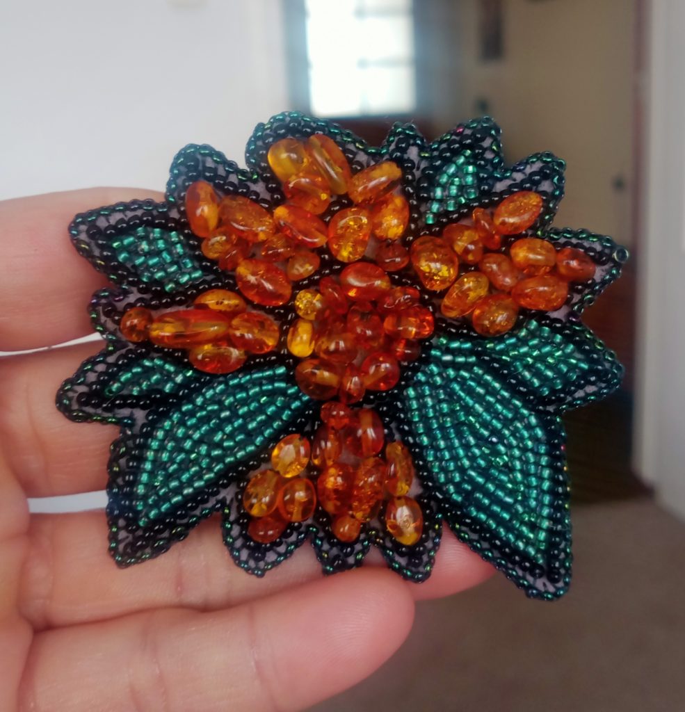 Broszka kwiat z bursztynem April 24, 2026 / Przepiękna broszka kwiat z bursztynem wykonana techniką haftu koralikowego.